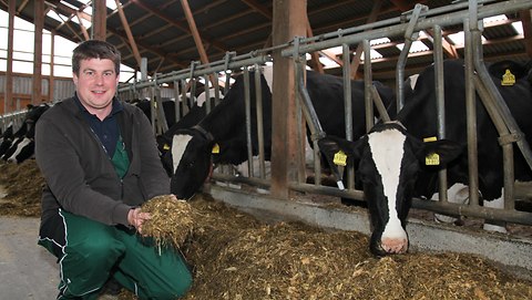 Außerdem hat Eike Holfeld beobachtet, dass die Kühe ihr Körpergewicht nach dem Abkalben besser halten können. Offenbar wird das Körperfett nicht mehr so stark abgebaut wie früher. Auch hier liegt die Erklärung darin, dass das energielose Stroh jetzt durch 350 g mehr Gras und 650 g SHREDLAGE® ersetzt wird, und dass den Kühen damit mehr energiereiches Grundfutter zur Verfügung steht. Auch die Kälber, die bis zum Alter von sechs Monaten die gleiche Mischung wie die Kühe bekommen, nehmen das neue Futter sehr gut auf und entwickeln sich stabiler als früher.