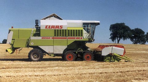 CLAAS startet TERRA TRAC Versuche an einem MEGA Mähdrescher. Die Laufräder sind luftbereift.